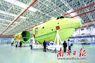 大型水陆两栖飞机AG600中机身、机头大部件先后运抵中航通飞珠海基地总装厂房。