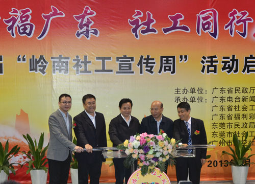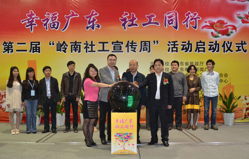 为深入贯彻落实中央18部委《关于加强社会工作专业人才队伍建设的意见》、《社会工作专业人才队伍建设中长期规划(2011-2020年)》,以及省委办公厅、省政府办公厅《关于加强社会工作人才队伍建设的实施意见》精神,进一步扩大社工影响,提升社工的社会知晓度、认同度,广东省民政厅联合广东电台新闻广播、广东省社会工作师联合会、广东省福利彩票发行中心、东莞市民政局于3月19日在东莞市举办第二届“岭南社工宣传周”活动启动仪式。
