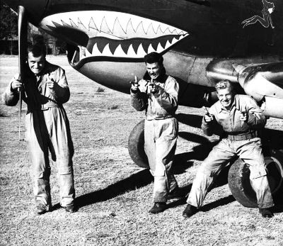 “飞虎队”!这是一个恰到好处的想象,但灵感究竟从何而来?这要归功于志愿航空队的“华盛顿中队”,这个名号是大卫科克伦、奎恩肖内西、怀迪威劳尔和比尔扬曼自封的。几个月前,这群在中国国防供应公司工作的人请求华特迪士尼的工作室设计一枚徽章。“龙”本应是最合适的选择――飞龙既象征着中国,也表明了空军的身份。但大卫科克伦建议用老虎代替龙,这个建议获得了大家的认可。(另一种说法是宋子文提出了这一建议。)设计要求被发送至好莱坞,迪士尼的两位员工罗伊威廉姆斯和亨利波特在10月设计出了草图:一只卡通化的孟加拉虎背插双翅,亮出爪子,从代表胜利的“V”字形图案上起跳。